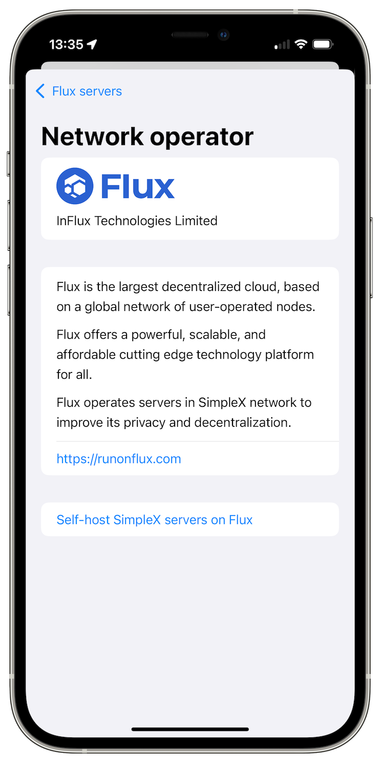 SimpleX Chat and Flux (Influx Technology Limited) made an agreement to include messaging and file servers operated by Flux into the app.